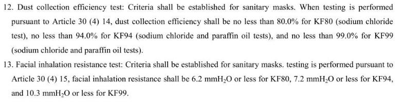 韓國的口罩標(biāo)準(zhǔn)KF (Korean filter) 系列,KF系列標(biāo)準(zhǔn)是由韓國的食品藥品管理部門 發(fā)布的韓國主流口罩標(biāo)準(zhǔn) 。KF系列分為KF80、KF94、KF99。KF80:≥80% (僅鹽性介質(zhì)) ;KF94:≥94%(油性和鹽性介質(zhì)) ;KF99:≥99% (油性和鹽性介質(zhì)) 。