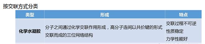 化學(xué)交聯(lián):分子鏈通過化學(xué)鍵交聯(lián)形成三維網(wǎng)絡(luò)結(jié)構(gòu),只發(fā)生溶脹而不會溶解,結(jié)構(gòu)穩(wěn)定性較好。制備方法包括高分子合成中加入交聯(lián)劑或者通過線性或支化高分子鏈中的官能團(tuán)反應(yīng)。