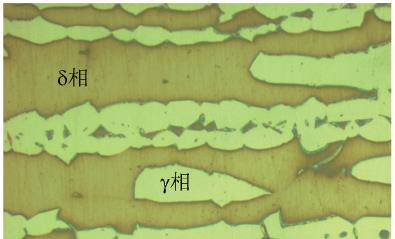 經(jīng)固溶處理后試樣的顯微組織形貌如圖1所示,可見(jiàn)顯微組織中有淺黃色奧氏體γ相與橘色鐵素體δ相,且兩相沿縱向呈帶狀分布。
