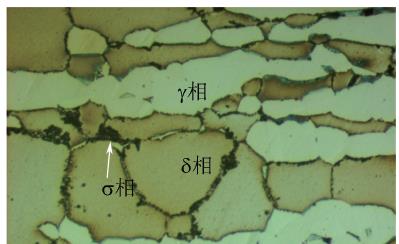 經(jīng)時(shí)效處理后試樣的顯微組織形貌如圖2所示,可見(jiàn)顯微組織中有淺黃色奧氏體γ相、橘色鐵素體δ相和沿晶分布的深褐色σ相。