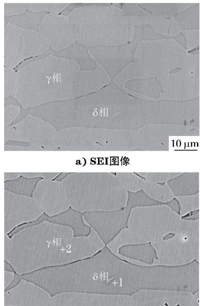 圖3為經(jīng)固溶處理+鐵氰化鉀氫氧化鉀溶液浸蝕后試樣的SEI圖像與BEC圖像,可見(jiàn)試樣的BEC圖像的浮凸感比SEI圖像的更強(qiáng),γ相和δ相的邊界線更清晰。
