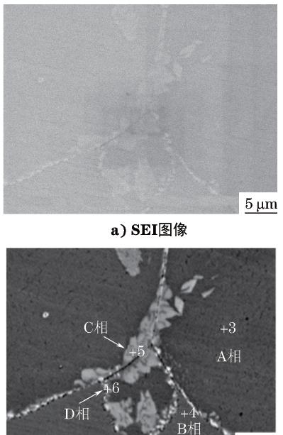 圖4為經(jīng)時(shí)效處理后未經(jīng)鐵氰化鉀氫氧化鉀溶液浸蝕的試樣的SEI圖像與BEC圖像,可見(jiàn)試樣的SEI圖像不清晰,而從其BEC圖像可以清晰看到灰度從深到淺再到白亮的A,B,C,D四種相,其中,C,D相位于相界,且D相數(shù)量明顯比C相的少。