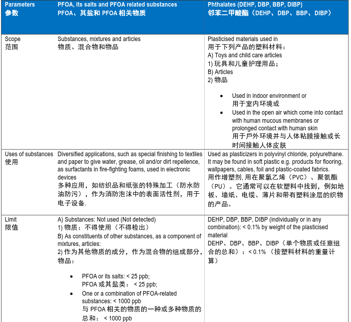 歐盟對(duì)全氟辛酸(PFOA) 和鄰苯二甲酸酯的限制要求將于由2020 年 7 月 4 日和 7 月 7 日之後實(shí)施。它們分別列在 REACH 附件十七條款68 和條款 51 。這兩項(xiàng)限制要求涉及的產(chǎn)品范圍廣泛,許多消費(fèi)品可能受到這兩項(xiàng)限制要求的監(jiān)管。