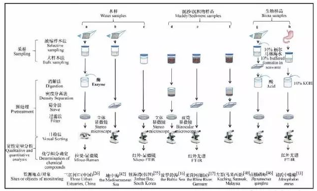 由于微塑料顆粒尺寸小、不易觀測,一定程度上限制了直接挑選法的應(yīng)用。因此,微塑料采樣方法越來越多地選擇大樣本法和濃縮樣本法。如何從采集的樣品中分離識別微塑料組分是樣品預(yù)處理的關(guān)鍵?,F(xiàn)階段較常見的預(yù)處理方法主要有目檢法、密度分離、過濾、篩分等。