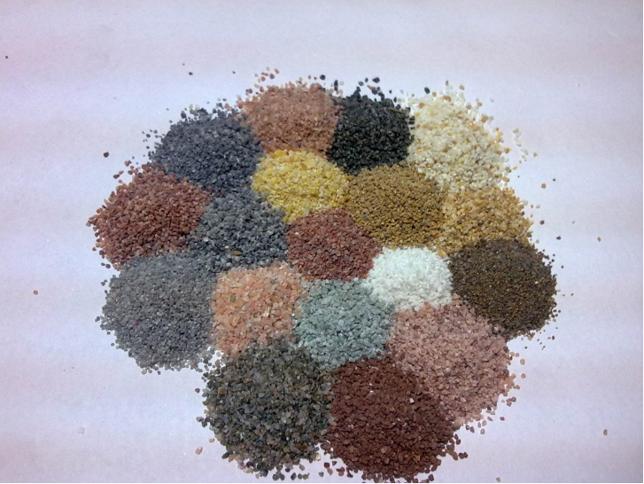 天然彩砂產(chǎn)品色系有:黑色系列彩砂,紅色系列彩砂,黃色系列彩砂,白色系列彩砂,綠色系列彩砂,藍(lán)色彩砂系列,灰色系列彩砂等。