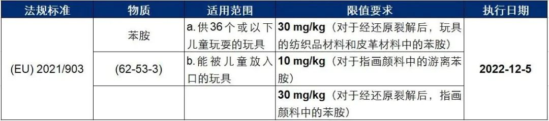 近日,歐盟委員會發(fā)布指令(EU) 2021/903,對玩具安全指令2009/48/EC附錄II附件C進行修訂。該指令規(guī)定了供36個月以下兒童使用的玩具或其他意圖放入口中的玩具中某些玩具材料的苯胺限量要求,成員國將從2022年12月5日起執(zhí)行苯胺限值。