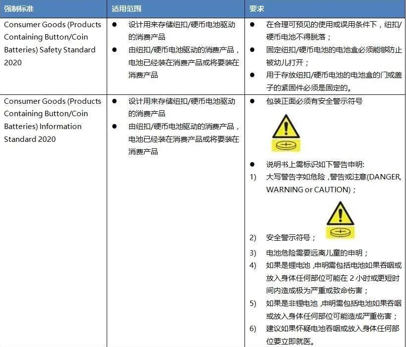 2020年12月22日,澳大利亞政府正式生效4個(gè)強(qiáng)制標(biāo)準(zhǔn)來減少因使用紐扣/硬幣電池造成的傷亡風(fēng)險(xiǎn)。強(qiáng)制性標(biāo)準(zhǔn)包括18個(gè)月過渡期,從2022年6月22日開始,供應(yīng)商必須符合該標(biāo)準(zhǔn)要求。