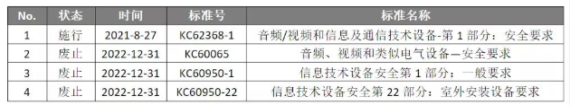 現(xiàn)有的IT設(shè)備標(biāo)準(zhǔn) K60950-1,K 60950-22 和AV 設(shè)備標(biāo)準(zhǔn)K60065將在 2022 年 12 月 31 日之前并行適用,該日期之后廢止。