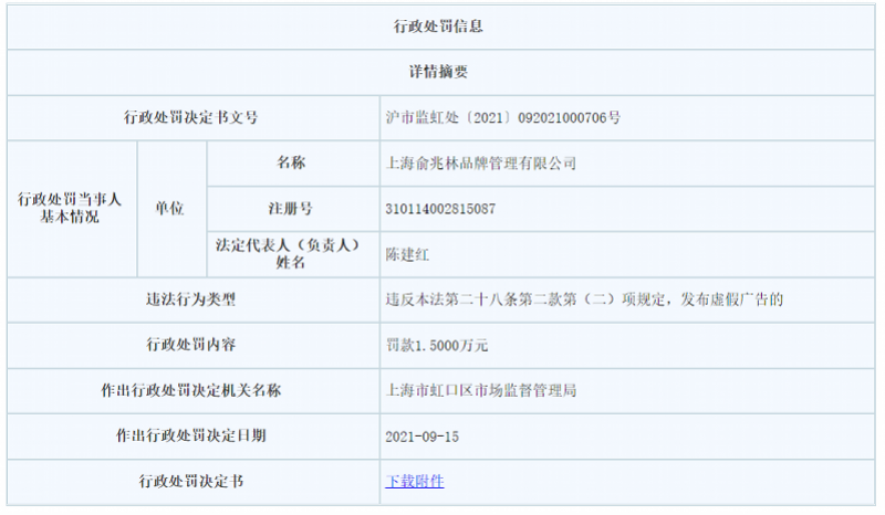 廣告中含有虛假內(nèi)容上海俞兆林被罰1.5萬元上海市市場監(jiān)管局官網(wǎng)顯示,經(jīng)查,上海俞兆林品牌管理有限公司于2020 年 11 月與成都市廣播電視臺簽訂當事人的產(chǎn)品“俞兆林駝絨被”的廣告發(fā)布合同,該合同約定在 2020 年 11 月 11 日、12 日、13 日白天時段在成都市廣播電視臺 CDTV-1 新聞綜合頻道上發(fā)布該產(chǎn)品的廣告,播出時間為白天時段,共播出 16 次,廣告費用共 5000 元,雙方已履行完合同。上海市俞兆林品牌管理有限公司為提高商品銷量,該廣告中宣稱上述產(chǎn)品的所用的被芯材料“駝絨”的保暖性,“1公斤該駝絨的保暖性相當于30公斤普通棉花,20公斤鴨絨,10公斤蠶絲”。該產(chǎn)品的實際保暖性能無法達到上述廣告所宣稱的性能,其內(nèi)容違法。上述行為違反了《中華人民共和國廣告法》相關規(guī)定,相關市場監(jiān)管部門責令上海俞兆林品牌管理有限公司停止發(fā)布廣告,以及在相應范圍內(nèi)消除影響,并罰款人民幣1.5萬元。據(jù)官網(wǎng)顯示,俞兆林優(yōu)品是上海俞兆林品牌管理有限公司旗下的中高端品牌線,成立于2019年。據(jù)天眼查,上海俞兆林品牌管理有限公司注冊資本為100萬元人民幣,經(jīng)營范圍包括企業(yè)管理、電子商務、知識產(chǎn)權服務、銷售針紡織品及原料,服裝服飾,鞋帽等。