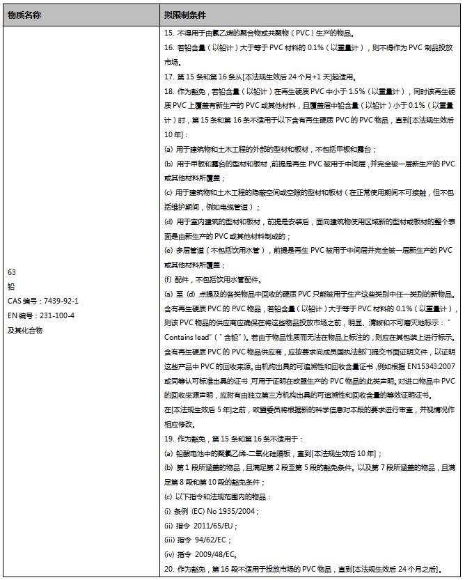 通報(bào)草案中對(duì)REACH法規(guī)附件XVII第63項(xiàng)擬新增限制內(nèi)容如下: