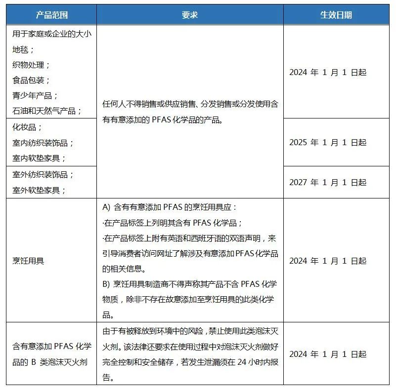 新法律將禁止有意添加PFAS到各種消費(fèi)品中,如小地毯或地毯、食品包裝、青少年產(chǎn)品、家具和化妝品,并要求含有PFAS的炊具必須貼上標(biāo)簽,還將監(jiān)管泡沫滅火劑的使用和儲(chǔ)存。下表總結(jié)了該法律的要求及生效日期