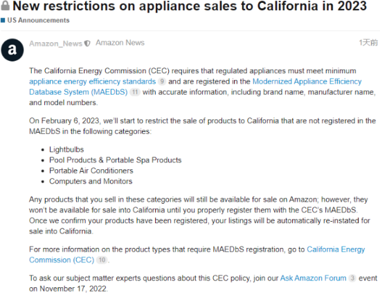 以上必須滿(mǎn)足CEC Title20電器能效標(biāo)準(zhǔn)要求,并在CEC能效數(shù)據(jù)庫(kù)系統(tǒng)(MAEDbS)中注冊(cè)列名,注冊(cè)信息包括品牌名稱(chēng)、制造商名稱(chēng)和型號(hào)等。也就是說(shuō)以上品類(lèi)必須滿(mǎn)足CEC Title 20 能效認(rèn)證,并在CEC 能效數(shù)據(jù)庫(kù)系統(tǒng)(MAEDbS)中注冊(cè)。如無(wú)CEC MAEDbS注冊(cè)的將無(wú)法在加州銷(xiāo)售,一旦賣(mài)家完成MAEDbS注冊(cè)將自動(dòng)恢復(fù)銷(xiāo)售