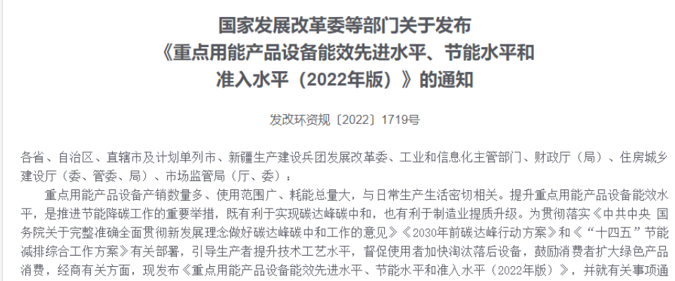 近日,國(guó)家發(fā)展改革委、工業(yè)和信息化部、財(cái)政部、住房城鄉(xiāng)建設(shè)部、市場(chǎng)監(jiān)管總局聯(lián)合發(fā)布了《重點(diǎn)用能產(chǎn)品設(shè)備能效先進(jìn)水平、節(jié)能水平和準(zhǔn)入水平(2022年版)》的通知。