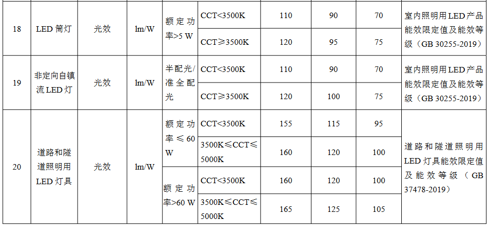 其中照明方面,《通知》羅列了20款能效三檔水平重點(diǎn)用能產(chǎn)品設(shè)備名單,其中LED筒燈、非定向自鎮(zhèn)流LED燈、道路和隧道照明用LED燈具三類(lèi)產(chǎn)品名列其中。