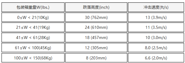 括一角三邊六面)或撞擊測試,不同重量的包裝箱其跌落高度和撞擊速度是不同的,如下頁圖所示: